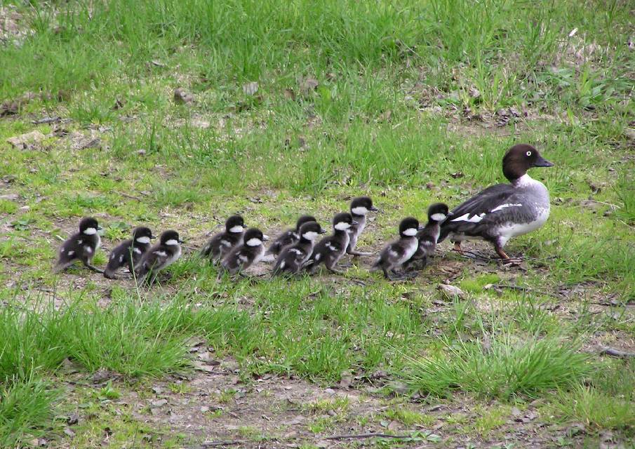Knipa (Bucephala clangula L.) med elva nykläckta på väg mot Täfteån